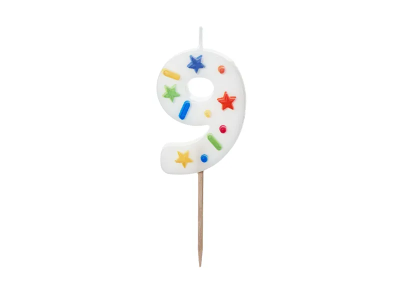 Świeczka urodzinowa Cyfra 9 w kolorze białym z konfetti na drewnianym patyczku, wysokość cyfry ok. 5.5 cm, wysokość całkowita ok. 10 cm.