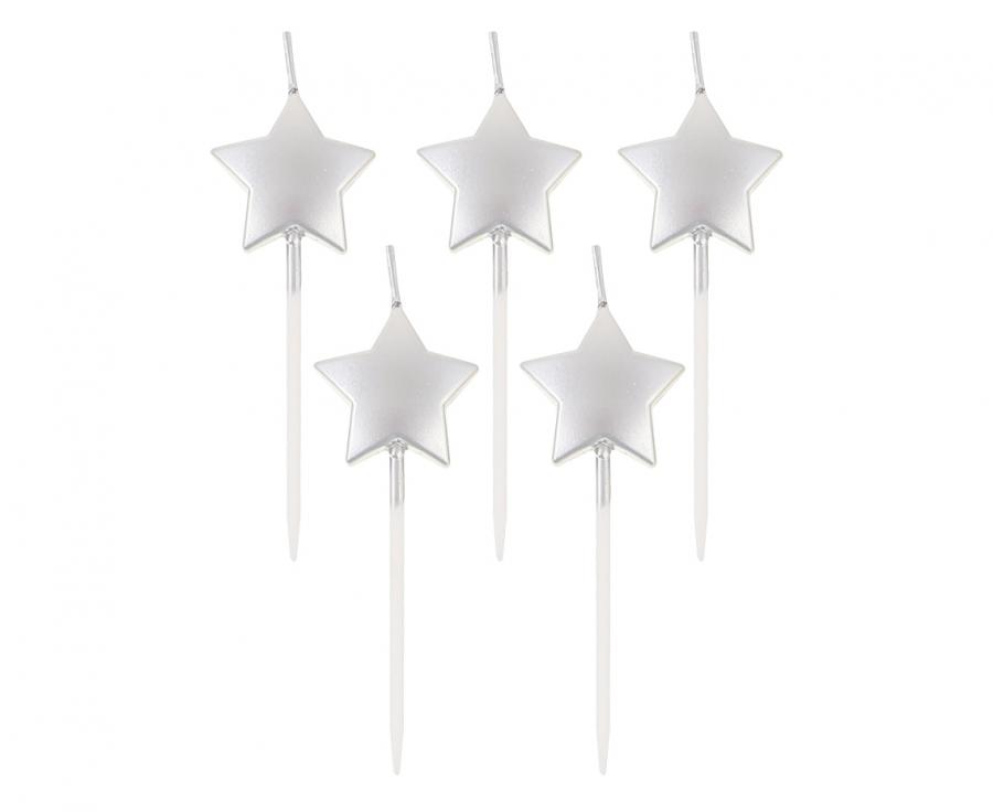ŚWIECZKI GWIAZDKI NA PATYCZKU SREBRNE, 5 SZT.
